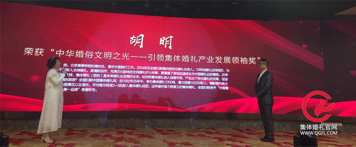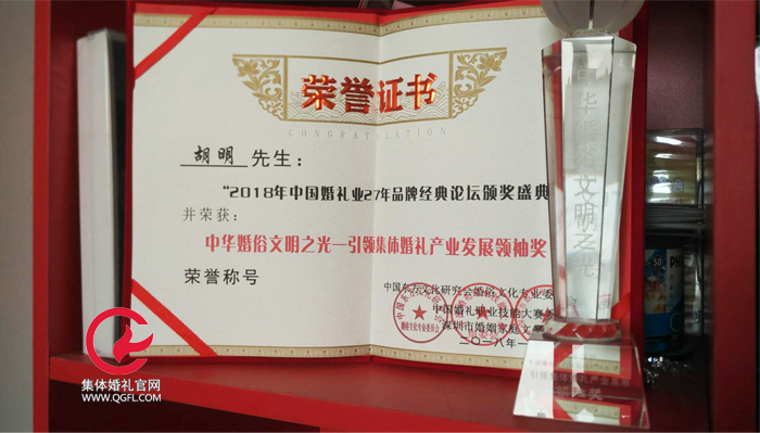 在2018年初,中國集體婚禮網胡明榮獲“中華婚俗文明之光----引領集體婚禮產業發展領袖獎”稱號,并頒發授予胡明證書及獎杯。