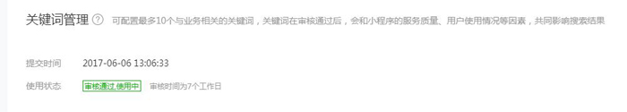 北京總部于2017年6月6日13時(shí)正式申請(qǐng)微信小程序“關(guān)鍵詞管理”功能,新人可通過(guò)關(guān)鍵詞搜索到集體婚禮網(wǎng)小程序。(數(shù)據(jù)來(lái)源于微信小程序后臺(tái)截圖,合適真?zhèn)慰稍诩w婚禮北京總部查看)