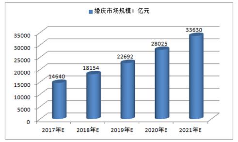 預計2017年我國婚慶市場規模將達到14640億元,未來五年(2017-2021)年均復合增長率約為23.11%,2021年市場規模將達到33630億元。(統計數據來源中國產業信息網)
