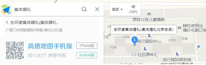 3、高德地圖同樣定位北京,搜索集體婚禮,便可找到集體婚禮北京總店位置。