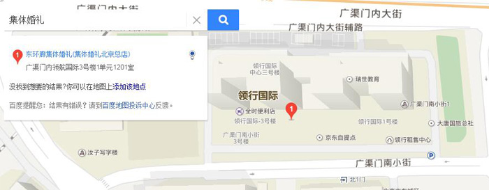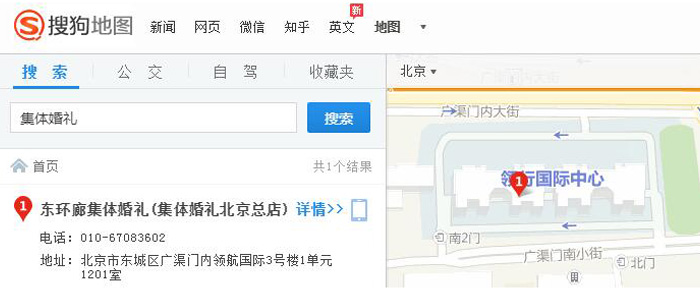 5、搜狗地圖定位北京,直接搜索集體婚禮,圖中直觀看到集體婚禮北京總店位于廣渠門內(nèi)大街,領(lǐng)行國際中心。