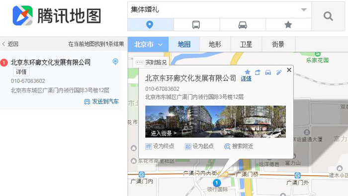4、騰訊地圖定位北京,直接搜索集體婚禮,便可查到集體婚禮總部公司相關(guān)信息,找不到還可以撥打提示的總部電話,也可以進入全景、街景查看。