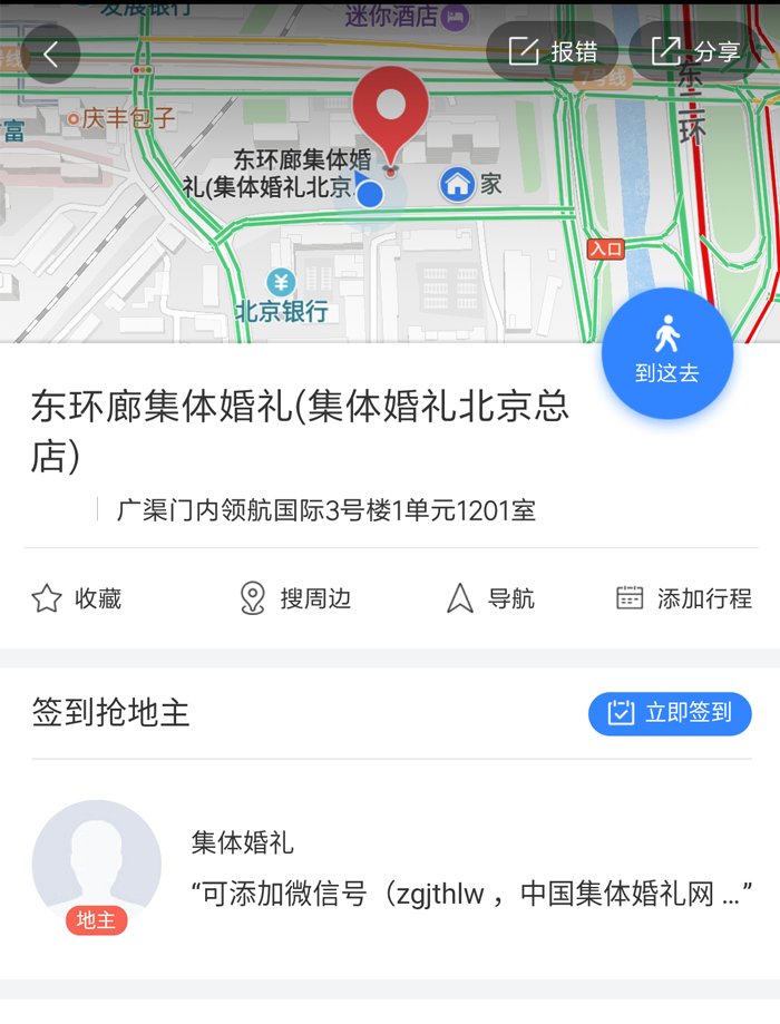 7、集體婚禮手機百度定位北京,搜索集體婚禮。精準(zhǔn)定位信息量更強大,有糾錯和分享功能,也能收藏或添加行程,更能簽到搶地主進行留言,最重要的是能找到中國集體婚禮網(wǎng)的微信號進行咨詢。