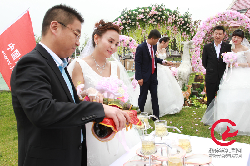 集體婚禮新人共同注入香檳美酒融入甜蜜愛河