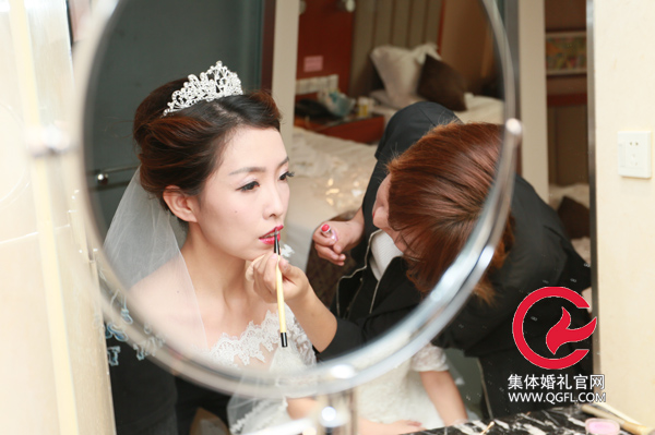 10月1日清晨,新人用過早餐后回到房間,化妝師為新人化妝。