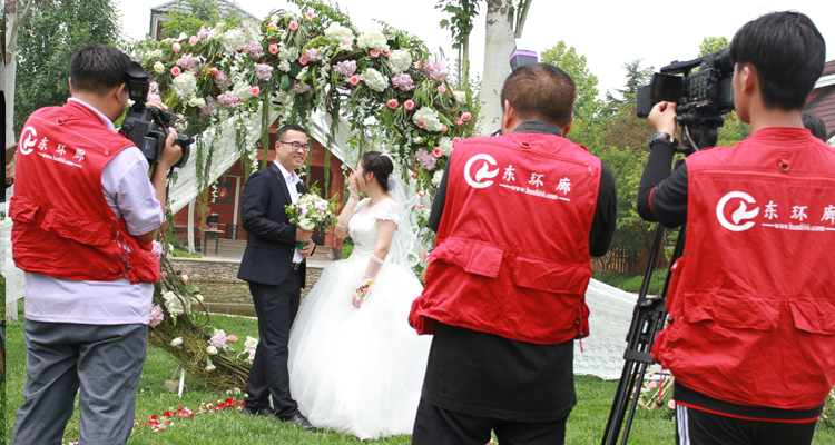 中國集體婚禮網北京總部專業團隊服務,婚禮當天氣溫高達32度,集體婚禮攝像、照相師傅們統一穿著紅色工作服,雖然大汗淋漓,但一定要把工作用心做好。