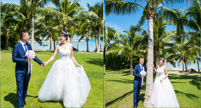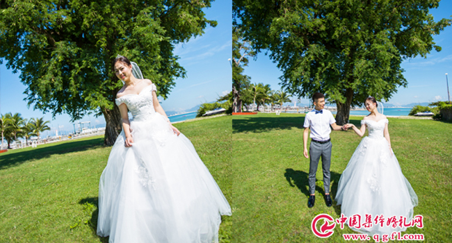 婚紗照是擺拍的,由三亞影樓專業(yè)人士為新人一對對拍攝,在草坪上、在大海邊,在花叢椰林邊。