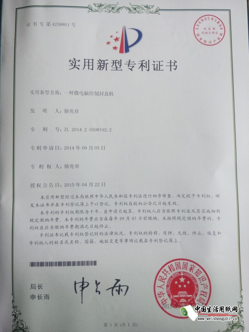 本機上面撥盒可以次一盒和多盒,根據天氣變化定型時間不同來設定一次撥多少盒。靈活運用。在機架下面裝有兩定向輪盒萬向輪便于挪動位置,傳統的封盒機每次挪動都要人抬著走。新型封盒機采用磁性接近開關。使用壽命比普通封盒機要長幾十倍,溶膠盒采用整塊鋁型材銑出來的。傳統的縫合機試用鋁板焊接加工成的,時間久了會漏膠水。 證書圖片 |