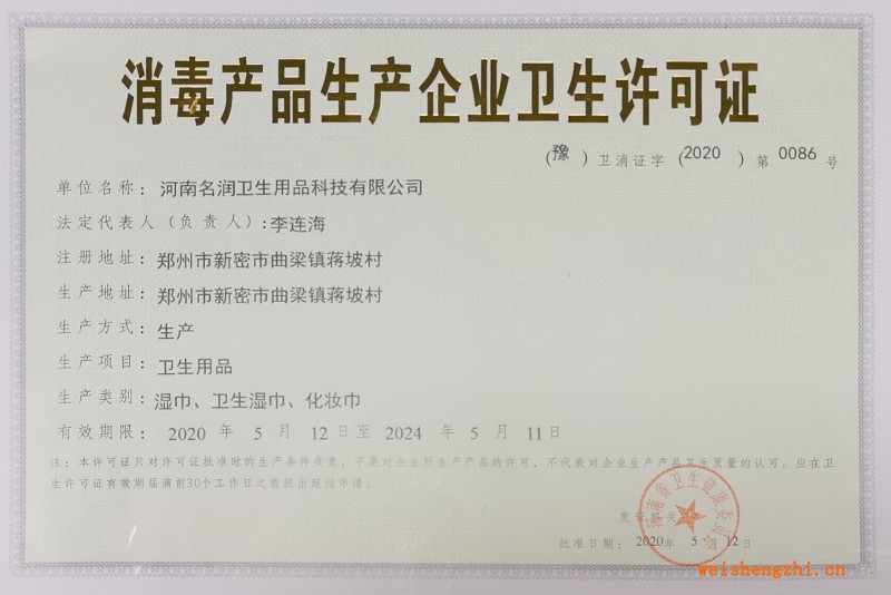 證書介紹 生產(chǎn)類別:濕巾、衛(wèi)生濕巾、化妝巾