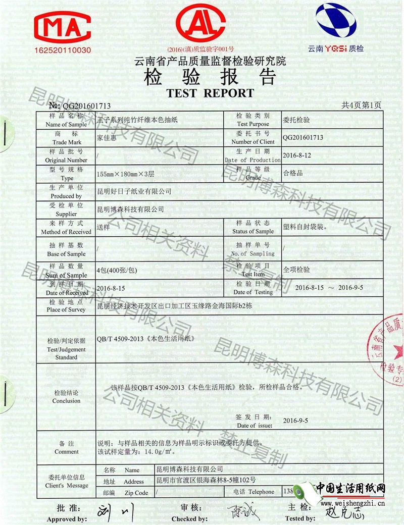 證書介紹 王子純竹纖維本色生活抽紙質(zhì)檢報告,按照標(biāo)準(zhǔn)項目,所有指標(biāo)全檢,并全部合格!
