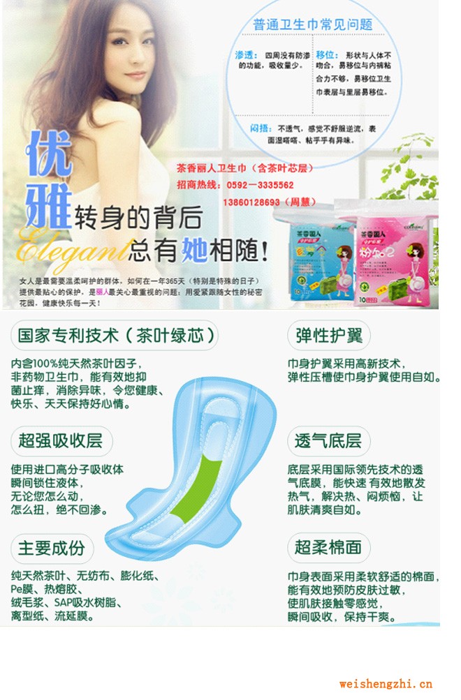 1、國家專利技術(shù)(茶葉綠芯)。內(nèi)含100%純天然茶葉因子,非藥物衛(wèi)生巾,能有效抑菌止癢,消除異味,令女性朋友健康、快樂、天天保持好心情。