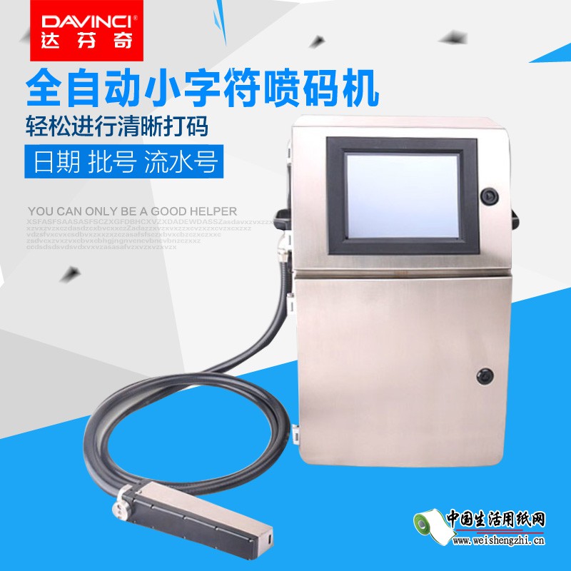 達芬奇衛生紙日期小字符噴碼機采用國際先進的球式黏度計和利用墨流速度、泵壓、及墨點飛行速度等多重方法控制墨水粘度自動檢測調整。全彩觸摸屏,中英文菜單轉換,自帶圖文編輯功能。本機采用32位嵌入式CPU及觸摸屏進行操作,可存儲2000條打印信息。多任務工作系統設置,噴印編輯同時進行,不需要停止生產線正常工作。
