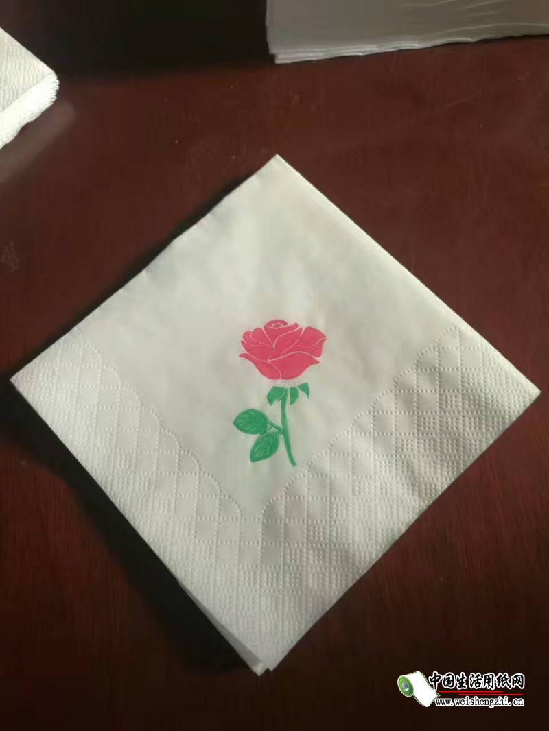 圖片中的餐巾紙上有一朵漂亮的花,花上有兩種顏色,這種是由于餐巾紙機(jī)器上具有彩印功能。要想在餐巾紙上達(dá)到兩種顏色的彩色印刷,餐巾紙機(jī)器就必須要具備兩色印刷的裝置,這個(gè)裝置可以用也可以不用,不用的時(shí)候做出來(lái)的餐巾紙就是沒(méi)有彩印的餐巾紙。