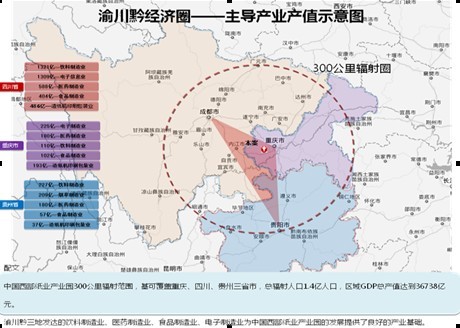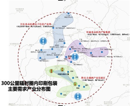 中國西部紙業產業園300公里輻射范圍,基可覆蓋川東食品醫藥電子信息產業帶(食品飲料產值382,電子信息284億,生物醫藥100億),環渝食品醫藥產業集群(食品產值102,電子信息112億,生物醫藥105億,煙草40億),黔東北煙酒產業發展區((白酒產值660億,煙產值132億)。總輻射人口1.4億人口,區域GDP總產值達到36738億元。