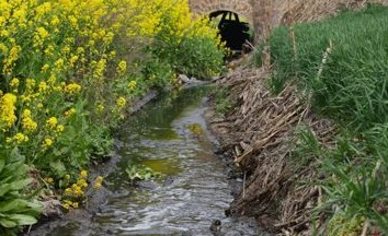 白云紙業的污水從郭莊村附近流入奎旺河支流中,污水溝兩邊是油菜與小麥。