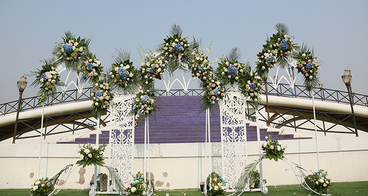 1、背景證婚亭、路引通道、香檳塔布景、花瓣雨。
