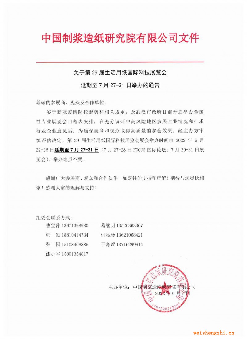 【重要通知】鑒于新冠疫情防控形勢和相關(guān)規(guī)定,及武漢市政府目前開啟舉辦全國性專業(yè)展覽會日程表安排,在充分調(diào)研中高風險地區(qū)參展企業(yè)情況和征求行業(yè)企業(yè)意見后,為確保展商和觀眾取得高質(zhì)量的參會效果,經(jīng)主辦方審慎評估決定,第29屆生活用紙國際科技展覽會展會舉辦時間由2022年6月22-26日延期至7月27-31日(7月27-28日FOCUS國際論壇;7月29-31日展覽會)。舉辦地點不變。特裝圖紙報圖時間延期至2022年7月2日以前,請悉知!