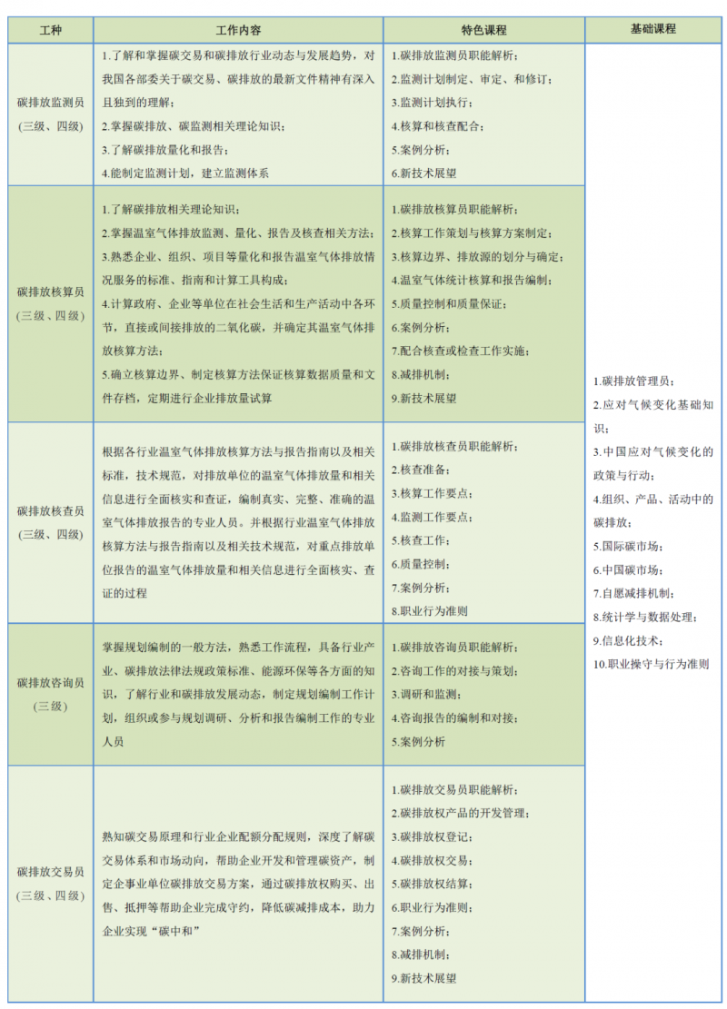 1. 可以從事碳排放監測員、碳排放核算員、碳排放核查員、碳排放交易員、碳排放咨詢員等多個工作。 2.可以提供碳排放監測、核算、核查服務,對企業的碳排放(主要是溫室氣體二氧化碳的排放)情況進行量化的監測、核算、核查,幫助政府部門掌握企業碳排放情況,以此制定碳排放配額的分配方案,對企業的碳排放進行有效監管管理,助力企業提前布局雙碳業務,走在行業前列。 3.可以提供咨詢和碳排放交易服務。根據企業的要求,對其碳排放情況進行量化,對照政府部門分配的排放指標,如果有剩余排放指標可以幫助企業進行排放指標交易。如果排放超標,碳排放管理師可以幫助企業計算需要購買的排放指標數據,在碳交易市場購買交易指標,也可以幫企業制定碳中和實施方案。 1. 發電、石化、化工、建材、鋼鐵、有色、造紙、航空等重點控排行業人員; 2. 從事節能減排、環境管理、現場管理、生產管理、項目管理、商務管理等相關人員; 3. 碳市場及試點碳市場控排企業的相關碳排放管理和技術人員,以及能源管理相關人員; 4. 從事能源、環境、循環經濟科研院所、大專院校相關領域技術、工程人員; 5. 政府、企事業單位等負責低碳發展及管理的相關人員; 6. 金融機構、大專院校、科研院所、咨詢機構、碳資產管理公司等機構相關人員; 7. 環境、能源、輕工、工程管理、計算機等相關專業應(往)屆畢業生; 8. 有志從事碳交易、碳管理、碳咨詢、碳核查等工作的人員。 碳排放管理員包含五個工種:碳排放監測員、碳排放核算員、碳排放核查員、碳排放交易員、碳排放咨詢員。 培訓課程分為公共基礎課程和專業課程兩部分,共80學時: