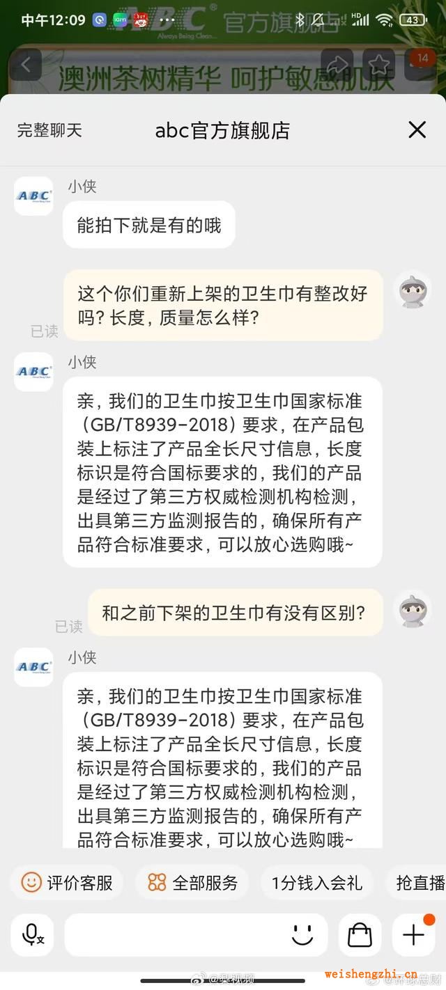 核心提示:12月26日,有網(wǎng)友發(fā)現(xiàn),ABC官方旗艦店部分產品重新上架,產品頁不再顯示缺貨狀態(tài),可下單購買。ABC旗艦店客服表示,能拍下就能購買。對于衛(wèi)生巾整改優(yōu)化一事,客服表示,ABC按衛(wèi)生巾國家標準(GB/T8939-2018)要求,