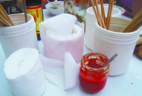 有市民撥打本報熱線電話反映,有的小吃攤、餐館的餐巾紙紙張非常薄,遇水便會立即濕透并成渣狀,與正規餐巾紙有顯著差異。而且有的紙面上還有黑點 ,撕扯時會有一些碎屑脫落,用起來讓人很擔心。記者對此進行了采訪,發現一些餐館和小吃攤仍然將衛生紙當作餐巾紙擺上餐桌,供就餐的市民使用。