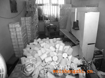 在北面的一間房子里,有一臺大的切割機。切割機旁邊堆放著已經切割好的衛生紙卷。