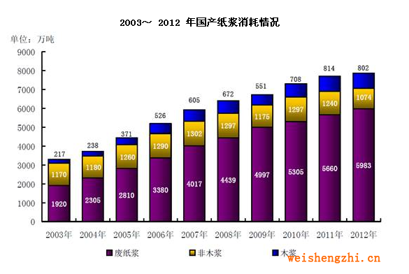 據中國造紙協會公布的2012我國紙漿消耗情況,2012年全國紙漿消耗總量9348萬噸,較上年增長3.36%。木漿2291萬噸,占紙漿消耗總量25%,其中進口木漿占16%、國產木漿占9%;廢紙漿5983萬噸,占紙漿消耗總量64%,其中進口廢紙漿占26%、國產廢紙漿占38%;非木漿1074萬噸,占紙漿消耗總量 11%,其中稻麥草漿占 6%、竹漿占 2%、葦(荻)漿占2%、蔗渣漿占1%。