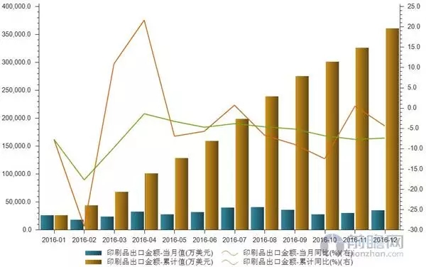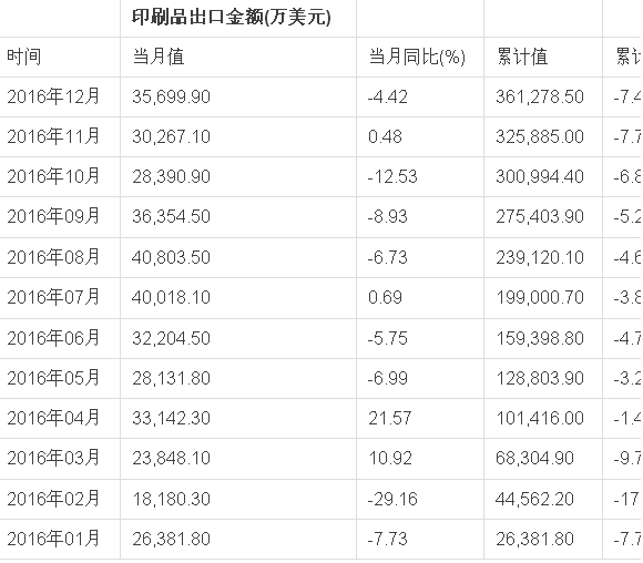 據數據顯示,2016年12月我國印刷品出口金額3.57億美元,當月同比下降4.42%;2016年全年出口金額累計36.13億美元,累計同比下降7.43%。