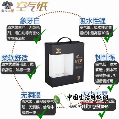 2)健康紙巾。空氣紙生產工藝中沒有用到水,根本沒有添加熒光劑、增白劑、熒光粉等有害化學物質至液體紙漿的工藝步驟。空氣紙是直接由絮狀的原木絨毛漿制成,健康用紙,享受生活。