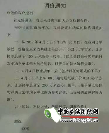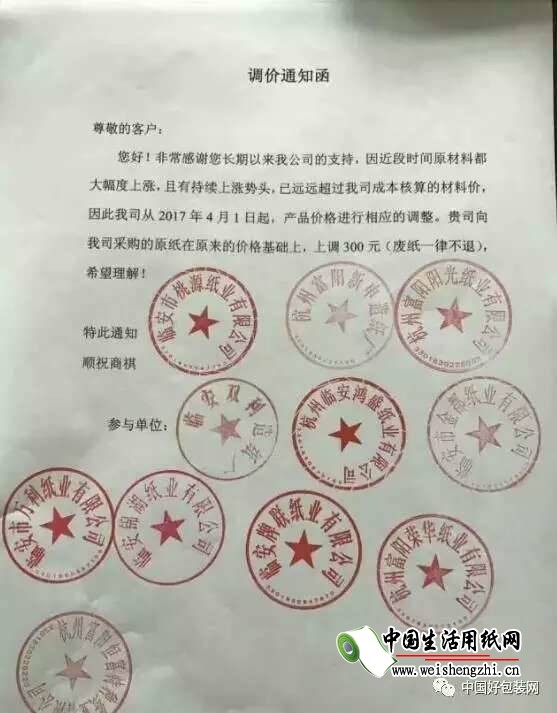 3月的后一天,來自造紙廠的漲價(jià)函再次飛起。浙江、安徽、福建等地二十多家造紙廠發(fā)出漲價(jià)函,多數(shù)造紙廠都選擇在4月5日那一天進(jìn)行提價(jià),多數(shù)每噸提價(jià)達(dá)300元,而其中富陽十一家造紙廠集體漲價(jià)的通知函尤其奪目。