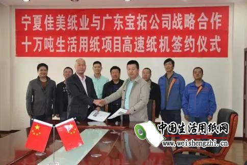 2017年4月17日,寧夏佳美紙業與廣東寶拓公司十萬噸高檔生活用紙項目高速紙機戰略合作簽約儀式在寧夏吳忠市隆重舉行。雙方簽訂第一期項目兩臺高速衛生紙機,寶拓為佳美紙業提供兩臺C1300-3550新月型衛生紙機,設計車速1300m/min,幅寬3550mm,供貨范圍為整體交匙鑰工程(包括制漿、造紙、后加工和包裝)。