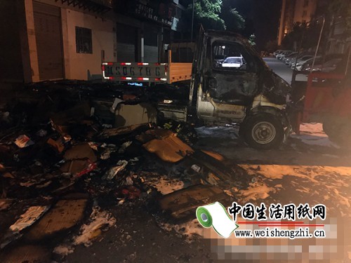 消防官兵到達現場后,只見一輛小貨車拉滿載一車紙板,停在道路中間,周圍都是過往的車輛。起火部位位于車廂上方,明火在猛烈燃燒,車頭已經燒得面目全非。消防官兵立即泡沫槍對起火點進行滅火,另一支水槍對油箱四周進行掃射冷卻。