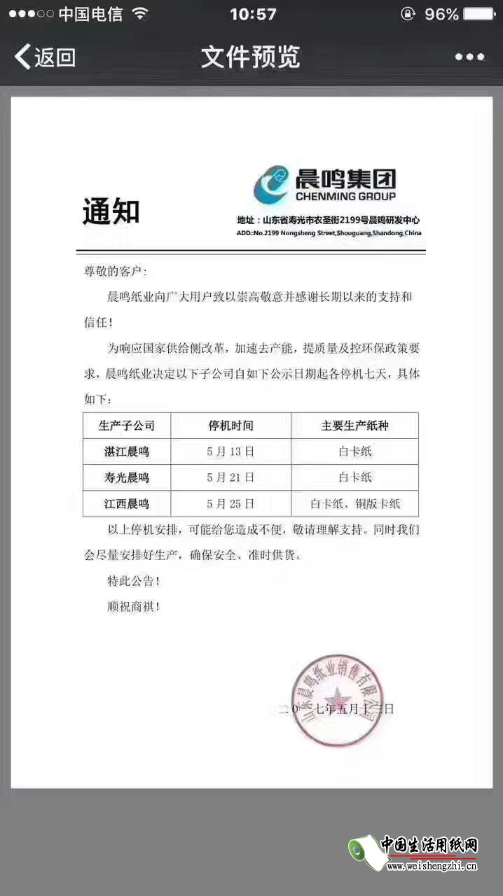 1.晨鳴紙業為響應國家供給側改革,加速去產能,提質量及控環保政策要求,晨鳴紙業決定以下子公司自如下公示日期起各停機七天,具體如下: