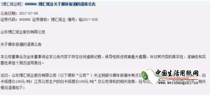 或許是這個歷時半年的反壟斷調查顯然給了造紙行業一定的壓力。7月8日,中國白卡紙四巨頭之一的博匯紙業發布澄清公告稱,網傳公司7月5日發布的自7月10日漲價100元/噸的消息并不屬實,公司目前執行的價格仍是3月份的價格。