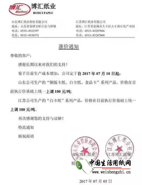 不過,經過詳細核實,除了7月5日這份疑似漲價函外,博匯公司自3月24日分別對“白卡紙、 食品卡和銅板卡紙”上調300-500元/噸以來,中間一直未有漲價函發出。至于7月5日發出的這份漲價函,該公司沒有明確說明其真偽。但有一點可以確認,公司不會執行這份漲價函的價格調整。