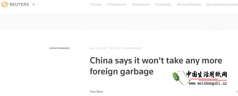 核心提示: 中國于周二正式通知世界貿(mào)易組織(WTO),表示今年底開始將不再接收外來垃圾,包括廢棄塑膠、紙類、廢棄爐渣、與紡織品。而禁令將會于2017年年底生效。 英國路透社7月19日報道稱,中國在送交WTO中的文件表示,