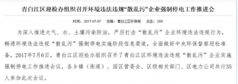 2017年7月6日,青白江區發布消息稱,為了全面做好中央環保督察迎檢準備,迎檢辦組織召開了青白江區環境違法違規“散亂污”企業實施強制停電工作推進會議。