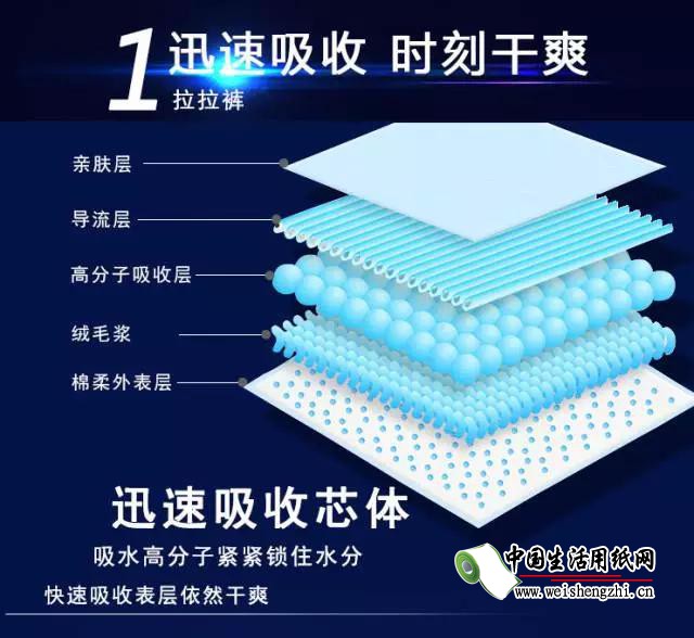 一般地,成人紙尿褲結(jié)構(gòu)上從內(nèi)向外分為三層,表層(緊貼皮膚,由無紡纖維布制成),吸收層(棉狀紙漿/吸收紙/有高分子吸水材料),隔水層(外層是不透水的塑膠膜)。