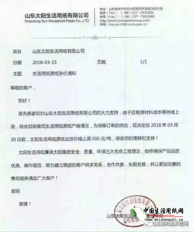 山東太陽生活用紙有限公司:近期原材料成本持續上漲,結合目前我司生活紙原紙銷售情況,目前決定自2018年3月20日起,太陽生活用紙原紙出貨價上調200元/噸。