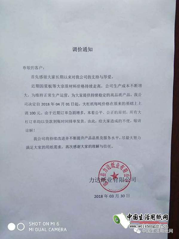 陜西法門寺紙業有限責任公司:受近期原材料價格不斷上漲,成本增加。為了保證我公司正常運營,經公司研究決定:自2018年4月3日起,生活用紙原紙、盤紙在現價基礎上上調100元/噸。