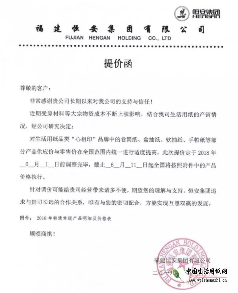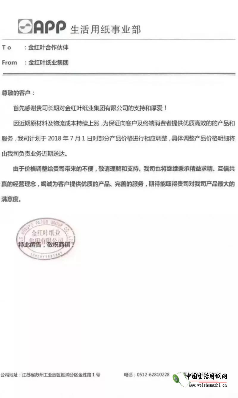 APP生活用紙事業(yè)部 金紅葉紙業(yè)集團:因近期原材料及物流成本持續(xù)上漲,為保證向客戶及終端消費者提供優(yōu)質(zhì)高校的產(chǎn)品和服務(wù),計劃在2018年7月1日對部分產(chǎn)品價格進行對應(yīng)調(diào)整。