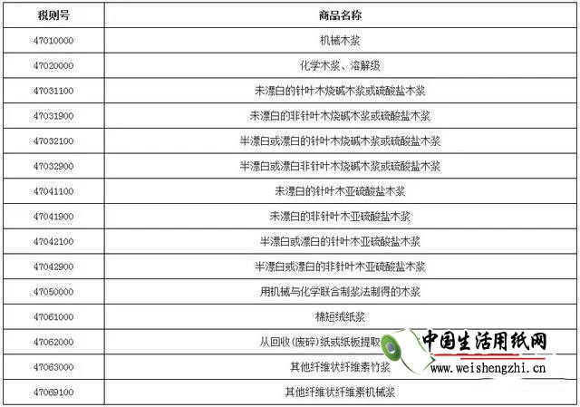 涉及紙漿稅則號一覽表