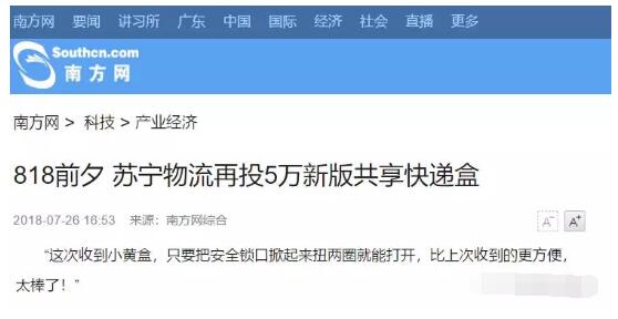目前,蘇寧物流在北京地區投放5萬個共享快遞盒Spuer版,用戶在蘇寧上下單購買3C數碼產品,都免費享用共享快遞盒來配送。
