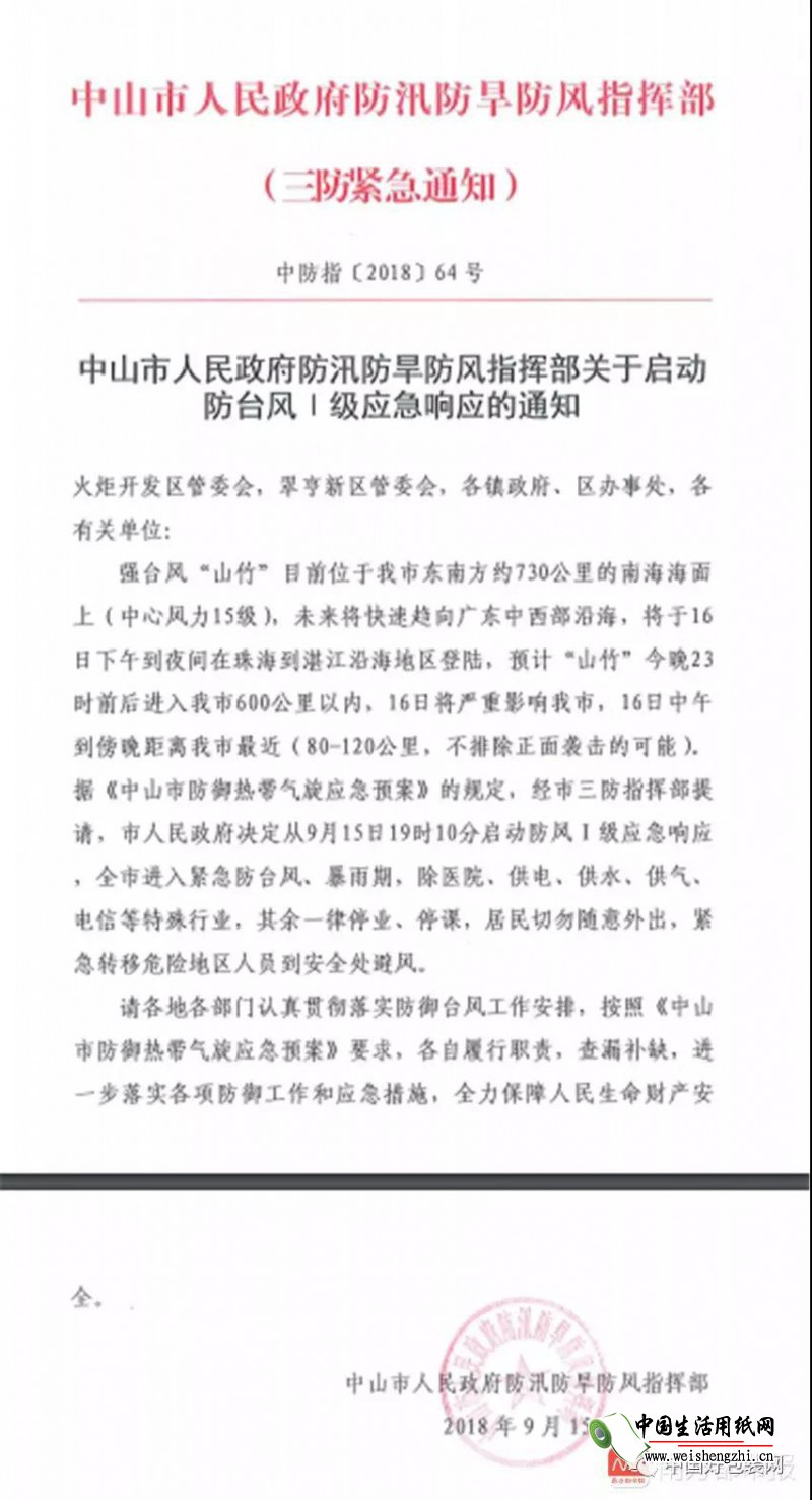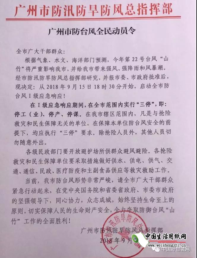 廣州市人民政府決定從2018年9月15日18時30分開始,啟動全市防臺風I級應急響應,除醫院、供水、供電、供氣、電信等特殊行業,在全市范圍內實行“三停”,即:停工(業)、停產、停課。請廣大市民群眾提前做好防范,正確防災避險。