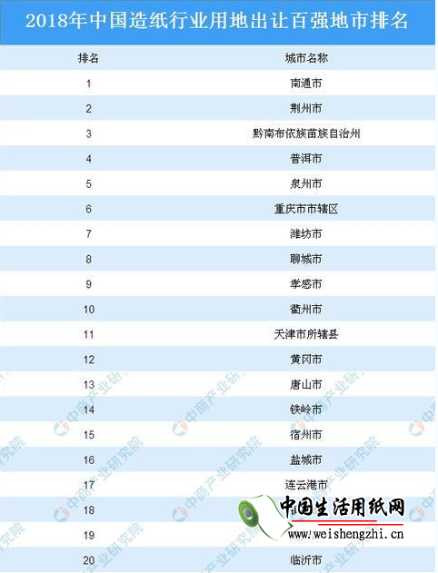據(jù)榜單顯示,進(jìn)入榜單前十的城市分別為:南通市、荊州市、黔南布依族苗族自治州、普洱市、泉州市、重慶市市轄區(qū)、濰坊市、聊城市、孝感市、衢州市。其中,南通市2018年造紙行業(yè)用地出讓面積排名全國(guó)第一,面積達(dá)2382畝,遙遙領(lǐng)先于其他企業(yè)。值得提出的是,南通市是2018年中國(guó)造紙行業(yè)用地出讓100強(qiáng)地市中唯一一個(gè)造紙行業(yè)用地出讓面積超2000畝的城市。荊州市和黔南布依族苗族自治州則分別排名第二和第三,其造紙行業(yè)用地出讓面積分別為1143畝和873.6畝。