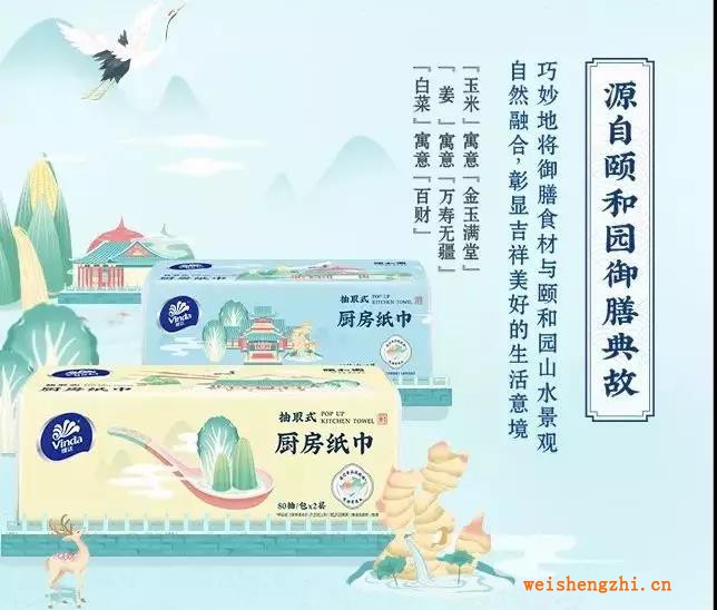 新款廚房紙巾厚實強韌,吸油吸水。產品包裝采用日常的食材:比如白菜,生姜、玉米、蓮藕、壽桃等形象,設計靈感源自頤和園御膳典故——“白菜”寓意“百財”,“玉米”寓意“金玉滿堂”,“姜”寓意“萬壽無疆”,“壽桃”寓意“健康長壽” ,巧妙地將御膳食材與頤和園山水自然景觀完美融合。