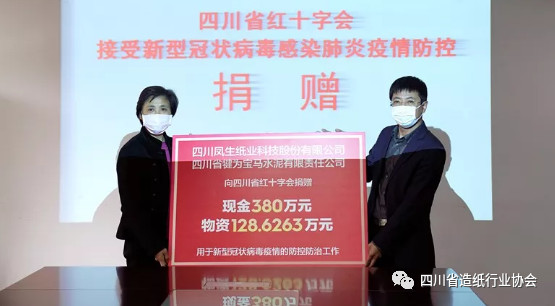 2月5日,四川鳳生紙業科技股份有限公司聯合四川省犍為寶馬水泥有限責任公司向四川省紅十字會無償捐贈508萬元,其中380萬元現金和128萬元物資(各類衛生用紙和濕紙巾),用于新型冠狀病毒疫情的防控防治工作。