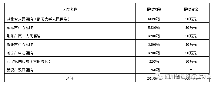 在協會、學會的號召組織下現有宜賓紙業股份有限公司、四川石化雅詩紙業有限公司、四川環龍新材料有限公司、四川鳳生紙業科技股份有限公司、四川福華竹漿紙業有限公司、四川祥恒包裝制品有限公司為支持抗擊疫情做了一些工作(截至2月6日,企業排名不分先后):