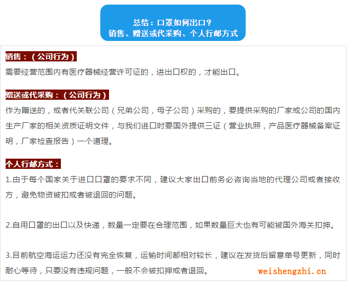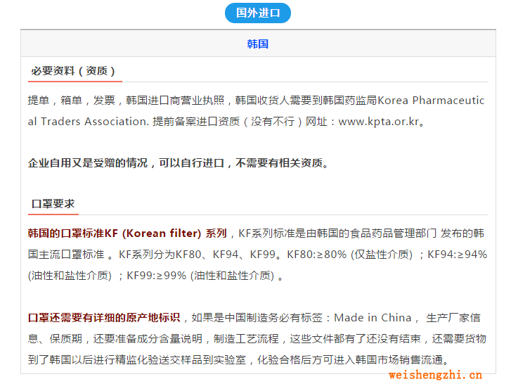 3月5日,美國貿易代表辦公室網站更新,對27家美國企業總計100多項進口中國的醫療相關產品,進行了關稅豁免。3月9日,中國駐韓國大使館新聞發言人表示,為支持韓國政府和人民抗擊新冠肺炎疫情,幫助韓方解決口罩供給問題,中方將于3月10日起向韓國出口口罩,首批500萬只,包括普通醫用口罩和N95口罩。今后中方還將繼續向韓國出口口罩。上述決定已通過外交渠道通報了韓國政府。發言人說,這是中國政府克服自身困難作出的決定,體現了中韓守望相助、同舟共濟的鄰里情、朋友義。中方愿同韓方,加強物資互助,分享信息經驗,開展聯防聯控合作,爭取早日共同戰勝疫情。此前,中國政府已決定向韓國援助110萬只口罩和1萬套醫用防護服。以下針對口罩等疫情物資的進出口問題,收集和整理了一些要求和規范,希望能幫助到疫情物資進出口企業。(僅供參考)