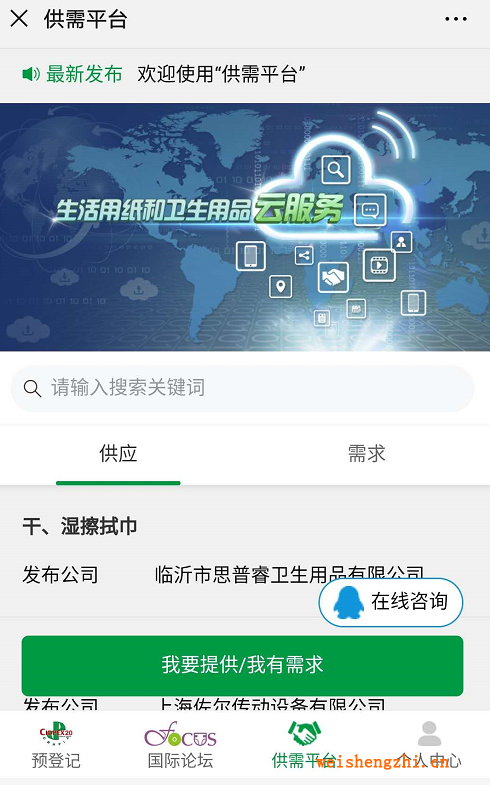 為幫助企業(yè)打破商貿(mào)停滯困局,打通供應(yīng)方及需求方溝通渠道,提高供需對(duì)接效率,由中國(guó)造紙協(xié)會(huì)生活用紙專業(yè)委員會(huì)推出的“生活用紙和衛(wèi)生用品云服務(wù)”二期項(xiàng)目之移動(dòng)端“供需平臺(tái)”正式上線啦!
