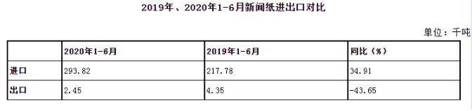進出口方面,海關數據顯示,2020年1-6月新聞紙進口293.82千噸,同比2019年上半年增加34.91%。1-6月累計出口量2.45千噸,同比2019年1-6月減少43.65%。出口量寥寥,對市場影響不大,進口量增加較多,利空國內市場。